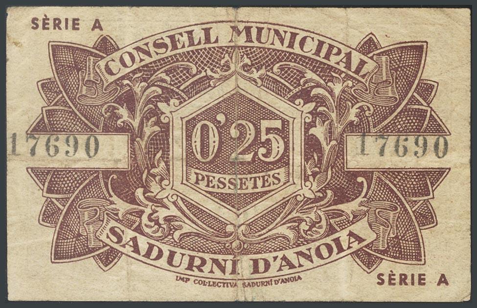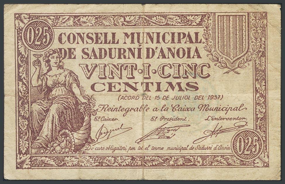 SADURNI D´ANOIA (BARCELONA). 25 Céntimos. 15 de Julio de 1937. Serie A. (González: 9804). MBC.