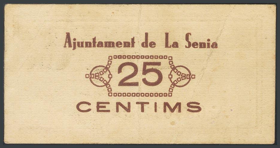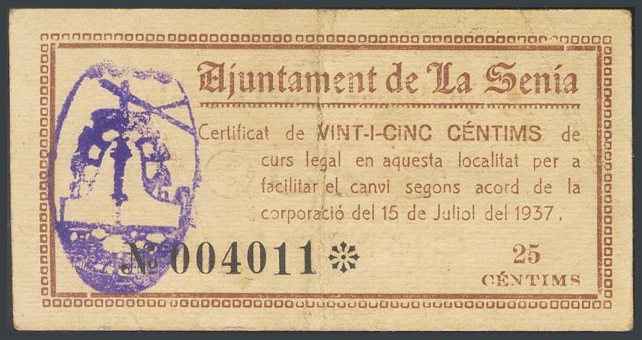 LA SENIA (TARRAGONA). 25 Céntimos. 15 de Julio de 1937. (González: 9940). MBC.