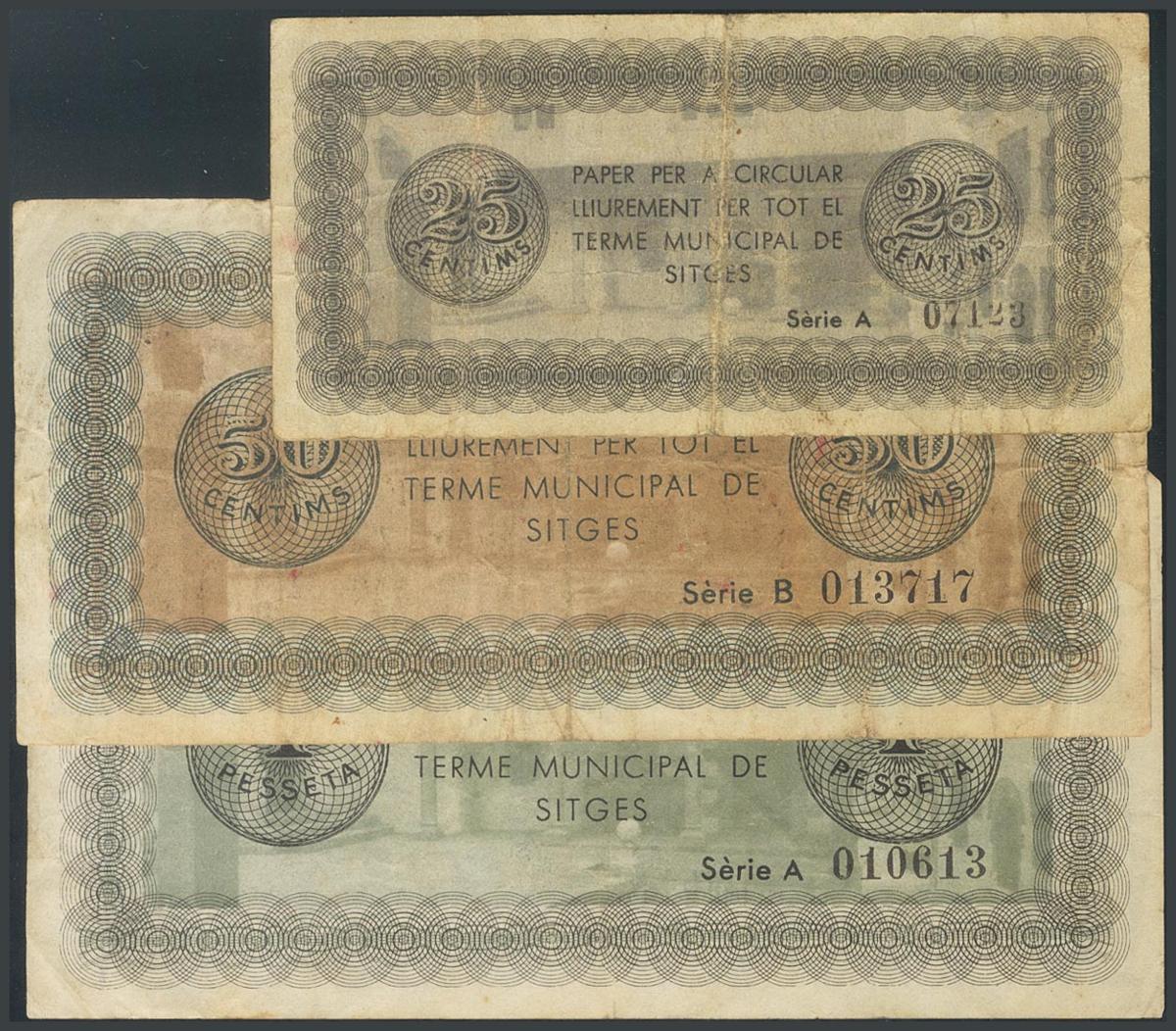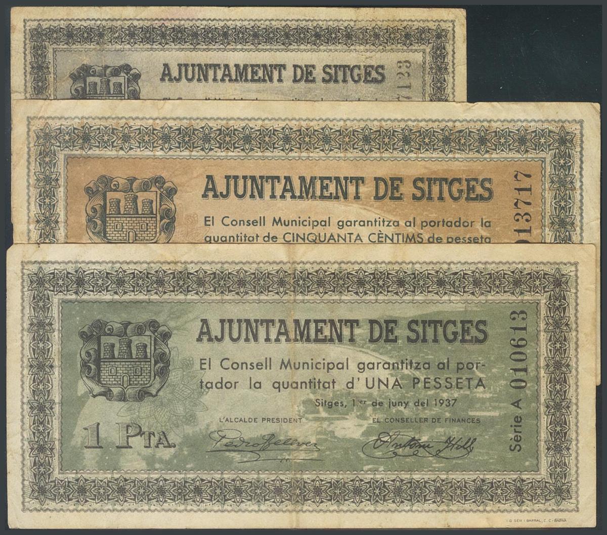 SITGES (BARCELONA). 25 Céntimos, 50 Céntimos y 1 Peseta. 1 de Junio de 1937 y 1 de Septiembre de 1937. Series A (2) y B. (González: 10013/15). MBC.
