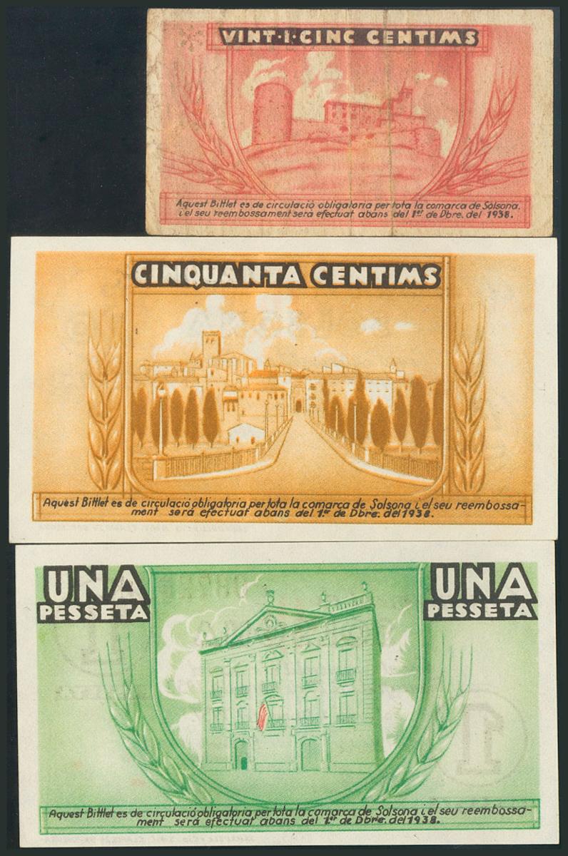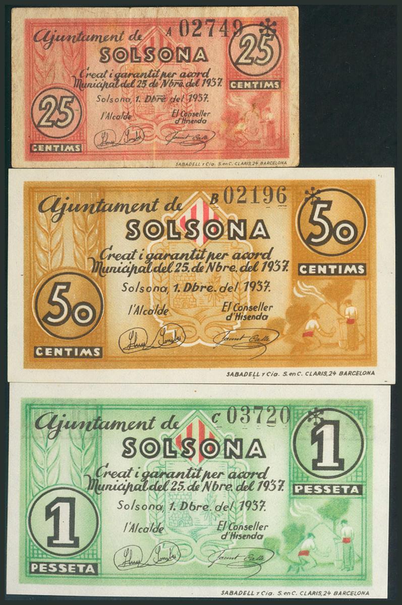 SOLSONA (LERIDA). 25 Céntimos, 50 Céntimos y 1 Peseta. 1 de Diciembre de 1937. Series A, B y C, respectivamente. (González: 10040/42). MBC/EBC.