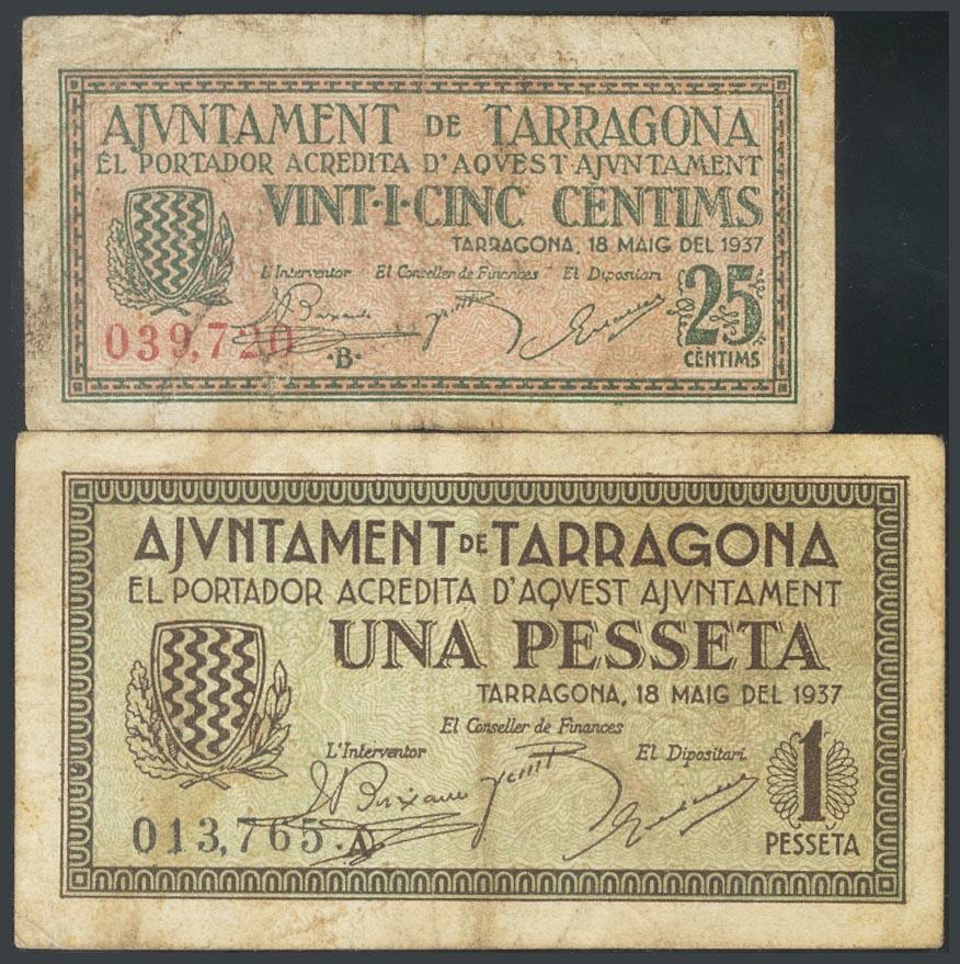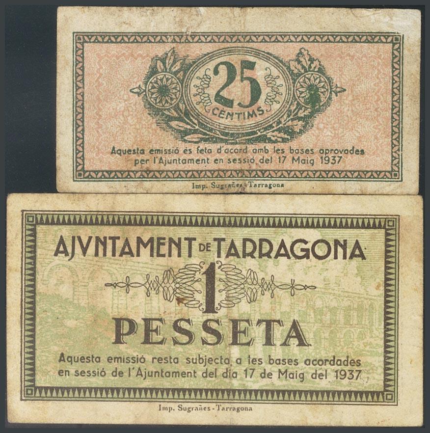 TARRAGONA. 25 Céntimos y 1 Peseta. 18 de Mayo de 1937. Series B y A, respectivamente. (González: 10085, 10087). MBC.