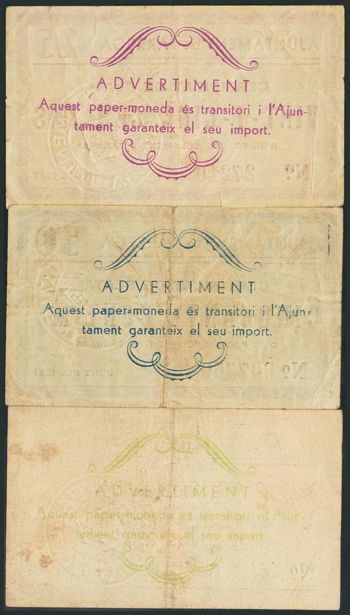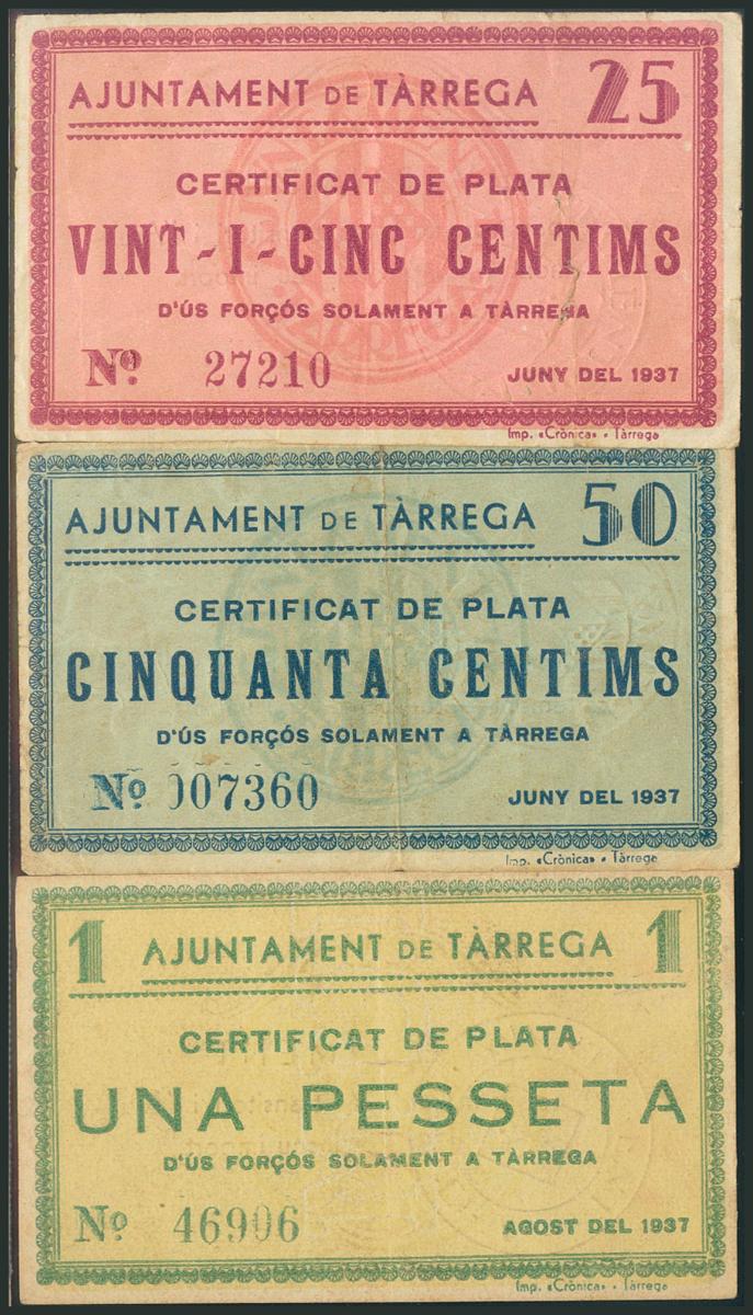 TARREGA (LERIDA). 25 Céntimos, 50 Céntimos y 1 Peseta. Junio 1937 y Agosto 1937. (González: 10101/02, 10103). MBC.