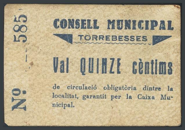 TORREBESSES (LERIDA). 15 Céntimos. (1938ca). (González: 10349). Raro. MBC.