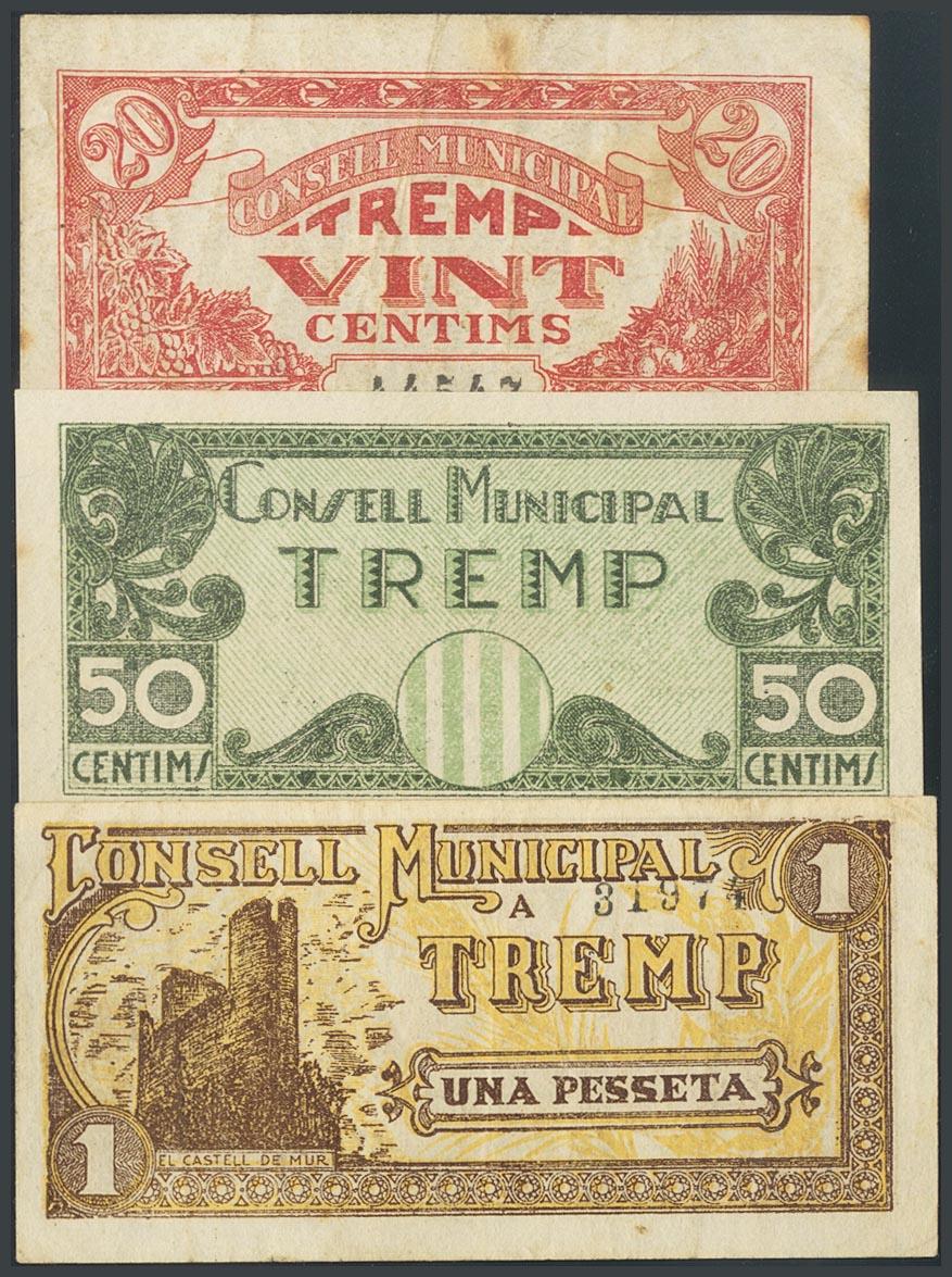 TREMP (LERIDA). 25 Céntimos, 50 Céntimos y 1 Peseta. (1938ca). El 1 Peseta serie A. (González: 10439, 10440, 10443). EBC-.
