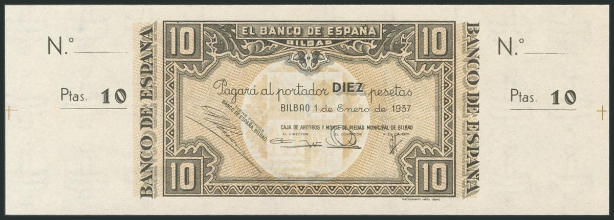 10 Pesetas. 1 de Enero de 1937. Sucursal de Bilbao, antefirma Caja de Ahorros y Monte de Piedad Municipal de Bilbao. Sin serie y sin numeración, con ambas matrices. (Edifil 2017: 387g). SC.