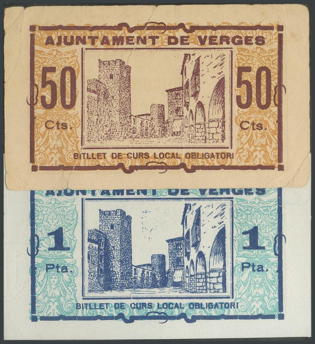 VERGUES (BARCELONA). 50 Céntimos y 1 Peseta. (1938ca). Serie A, ambos. (González: 10625). MBC-/SC.