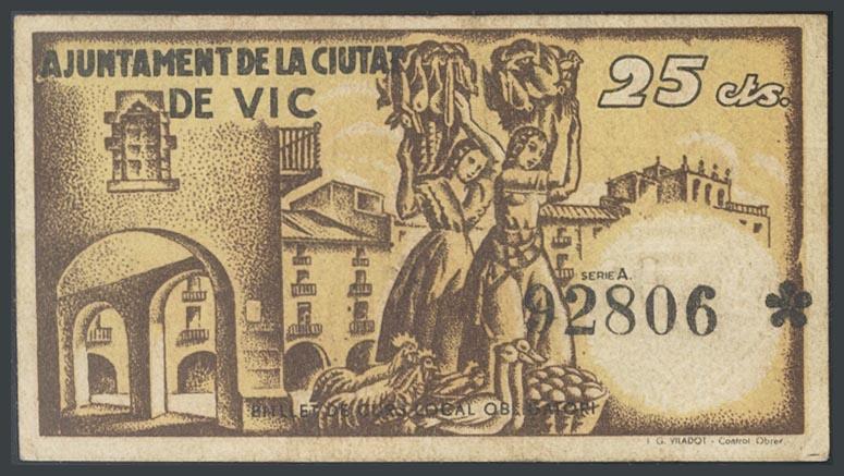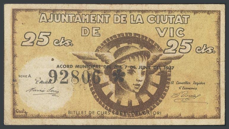 VIC (BARCELONA). 25 Céntimos. 7 de Julio de 1937. Serie A. (González: 10629). MBC+.