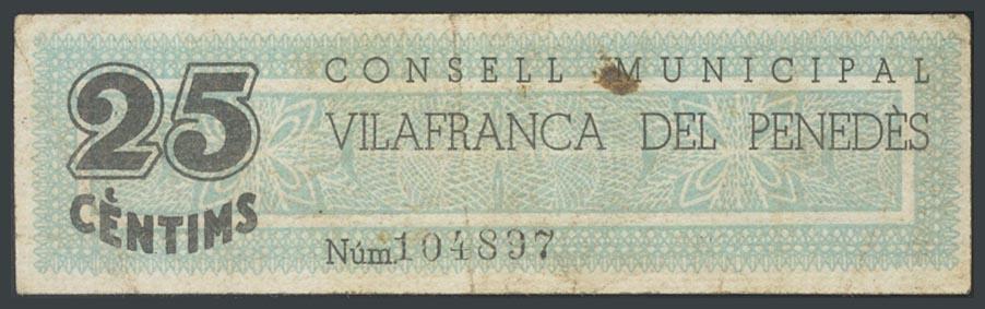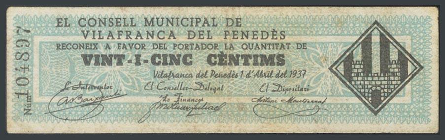 VILAFRANCA DEL PENEDES (BARCELONA). 25 Céntimos. 1 de Abril de 1937. (González: 10708). MBC.