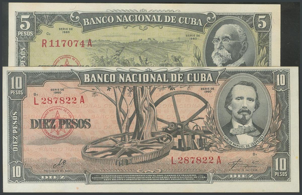 CUBA. Set of 2 banknotes of 5 Pesos and 10 Pesos. 1960. (Pick: 88c, 91c). One round corner on 5 Pesos. Uncirculated.
