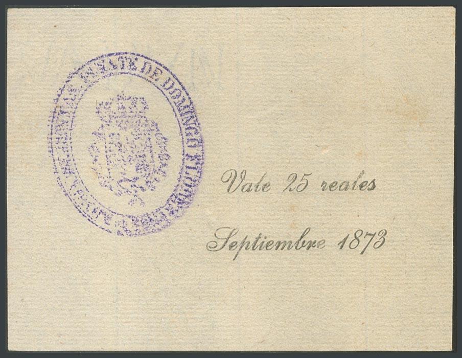 25 Reales. Septiembre de 1873. Vale de la Administración de Rentas de Puente de Domingo Flórez (León). (Edifil 2017: Página 26). Muy raro. EBC.
