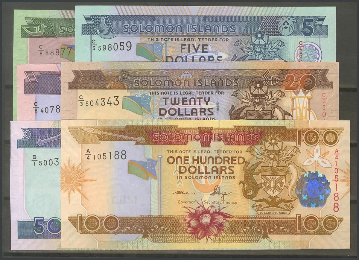 SOLOMON ISLANDS. 1 Dollars, 5 Dollars, 10 Dollars, 20 Dollars, 50 Dollars and 100 Dollars. (2004ca). (Pick: 25/30). Uncirculated.