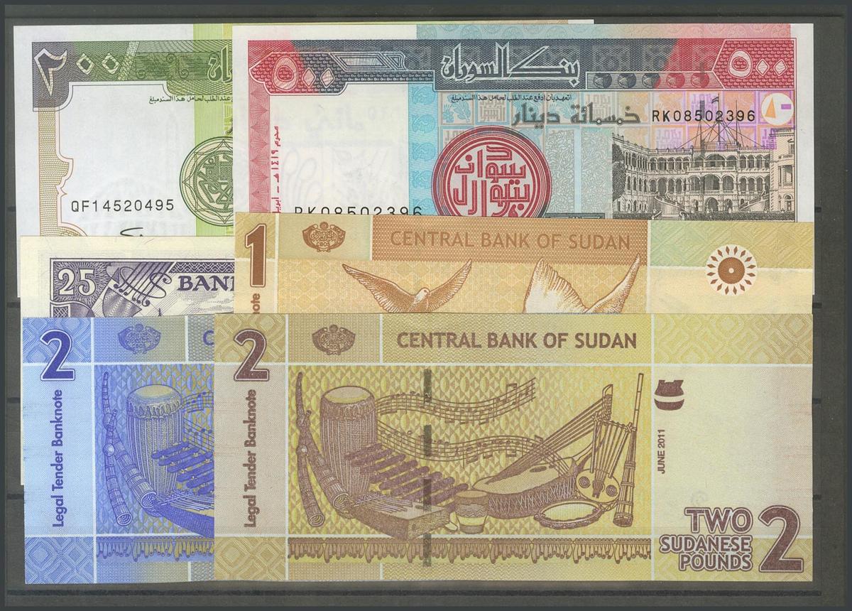 SUDAN. Set of 6 banknotes of 25 Piastres, 200 Dinars and 500 Sudanese Dinars, 1 Pounds, 2 Pounds and 2 Sudanese Pounds. (1987ca). (Pick: 37, 57b, 58b, 64a, 65a, 71a). Uncirculated.
