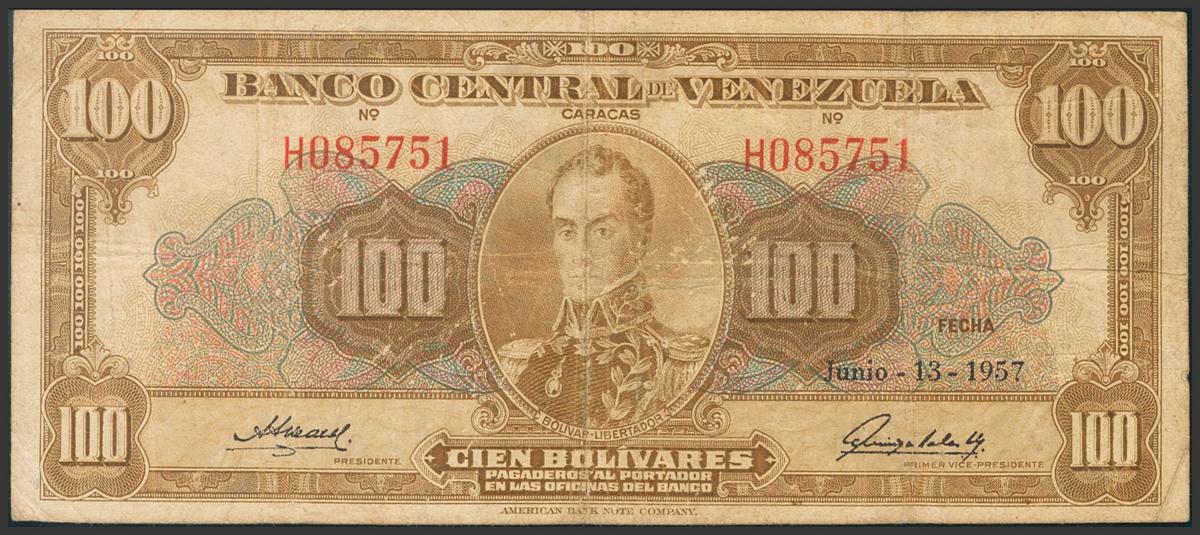 VENEZUELA. 100 Bolívares. 13 de Junio de 1957. Serie H. (Pick: 34c, Sleiman: 59). VF-.