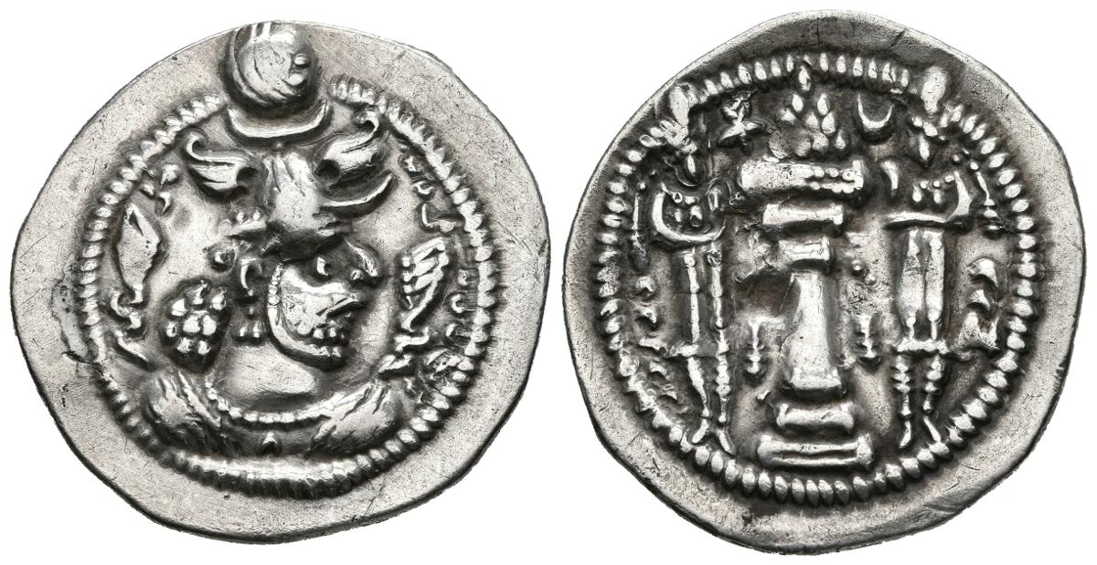 IMPERIO SASANIDA, Hormzid IV. Dracma. (Ar. 3,71g/27mm). Istakhr (ST). Anv: Busto coronado de Hormzid IV a derecha. Rev: Altar con fuego entre dos guardianes, en campo estrella y creciente. (Göbl I/1). MBC+.