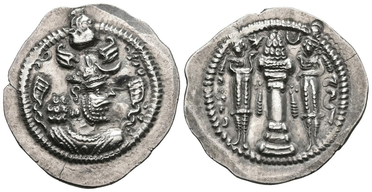IMPERIO SASANIDA, Peroz I. Dracma. (Ar. 4,16g/28mm). Veh-Antiok-Shapur (WH). Anv: Busto coronado de Peroz I a derecha. Rev: Altar con fuego entre dos guardianes, en campo estrella y creciente. (Göbl Type III/1). EBC-.