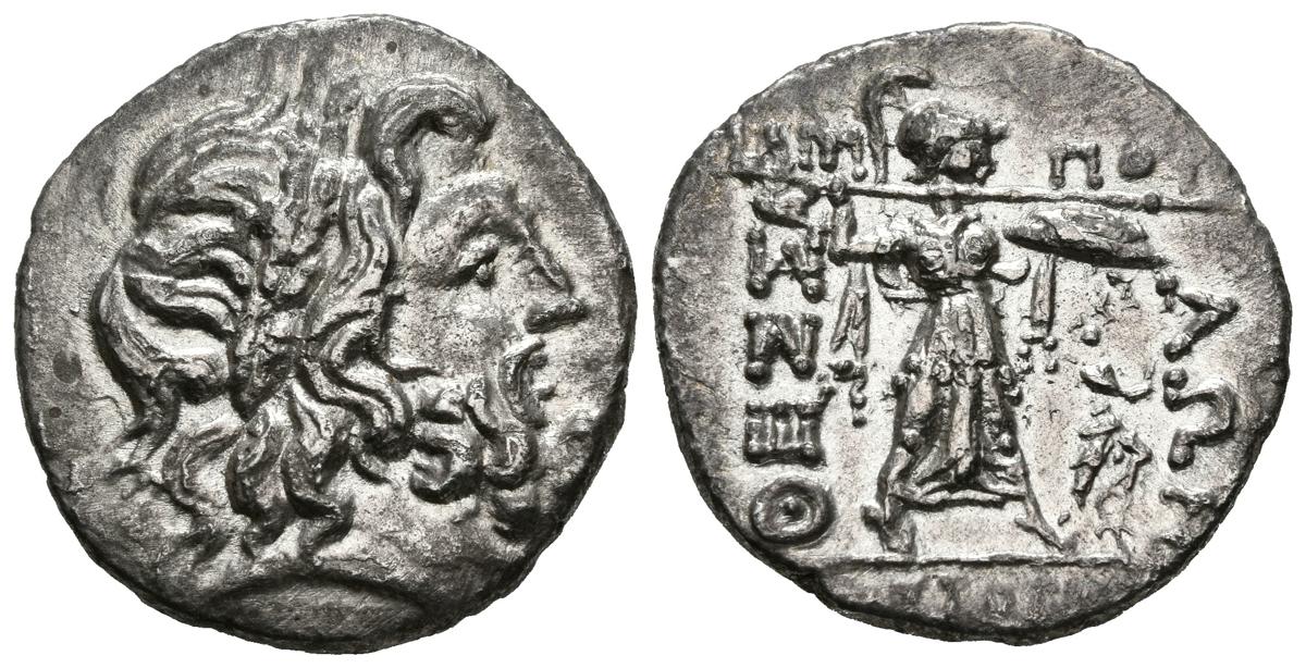 LIGA TESALICA. Doble Victoriato. (Ar. 5,93g/21mm). 196-146 a.C. Anv: Busto laureado a derecha de Zeus. Rev: Atenea en pie a derehca portando lanza y escudo, delante Artemisa con antorcha, alrededor leyendas griegas. (SNG Copenhagen 296). EBC-. Precioso ejemplar. Brillo original.