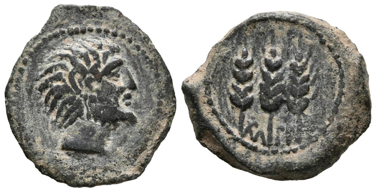 MAURITANIA, Tingi. Ae21. (Ae. 3,75g/21mm). 118-33 a.C. Anv: Cabeza barbada a derecha. Rev: Tres espigas, entre ellas leyenda neopúnica. (SNG Copenhagen 737). MBC.