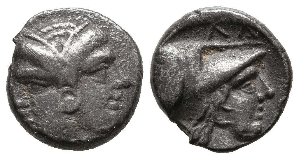 MISIA, Lampsakos. Dióbolo. Siglo III-IV a.C. A/ Cabeza femenina janiforme con pendiente de aro circular. R/ Cabeza con casco de Athena a derecha. SNG France 1193; SNG von Aulock 1295. Ar. 1,20g. Pátina oscura. MBC-/MBC.