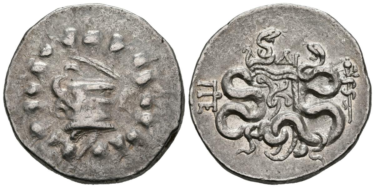 MISIA, Pérgamo. Cistóforo. (Ar. 12,58g/27mm). 104-98 a.C. Anv: Cista mística con una serpiente, rodeada de corona de yedra. Rev: Dos serpientes entrelazadas alrededor de carcaj y arco, a la izquierda y encima monogramas griegos y a la derecha thrysos entrelazado con serpiente. (SNG BN 1719). MBC/EBC-.