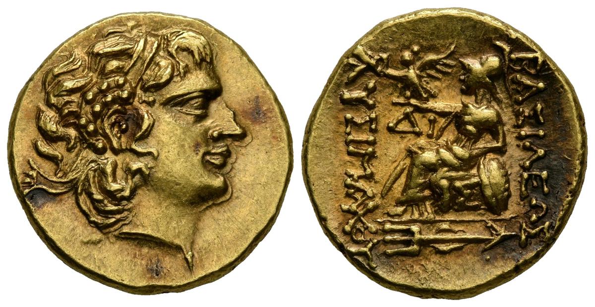 REYES DE PONTOS, Mithradates VI Eupator. Estátera. (Au. 8,29g/19mm). 88-86 a.C. Istros. Anv: Cabeza diademada de Alejandro III el Grande a derecha con cuerno de Ammon. Rev: Atenena Nikephoro sentada a izquierda portando Victoria y apoyando el codo izquierdo sobre escudo, delante AI, debajo del trono IM, debajo tridente ornamentado, alrededor leyenda griega. (SNG Copenhagen 1094). EBC+. Precioso ejemplar, escaso en esta calidad.