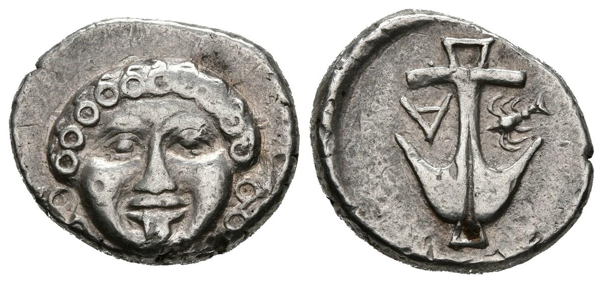 TRACIA, Apolonia Pontica. Dracma. (Ar. 2,85g/15mm). 400-300 a.C. Anv: Cabeza de frente de Gorgona. Rev: Ancla, entre A y langosta. (HGC 3, 1324). MBC.