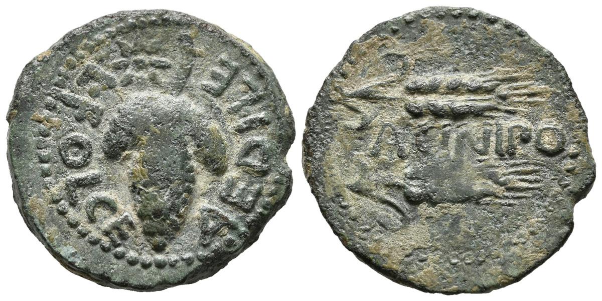 ACINIPO (Ronda, Málaga). As. (Ae. 8,22g/23mm). 100-50 a.C. Anv: Racimo de uvas, encima estrella, alrededor: L. FOLCE. AEDILE. Rev: Dos espigas a derecha, entre ellas: ACINIPO. (FAB-59). MBC.
