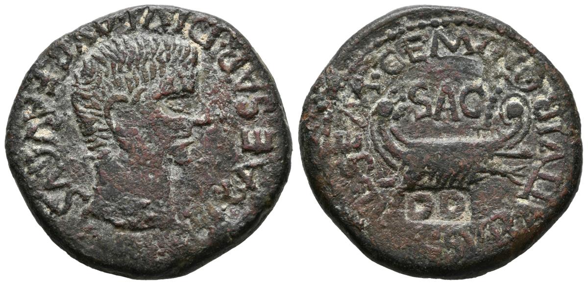ARSE-SAGUNTUM (Sagunto, Valencia). As. (Ae. 12,97g/29mm). 14-36 d.C. Anv: Cabeza de Tiberio a derecha, alrededor leyenda: TI. CAESAR. DIVI. AVG. F. AVG. Rev: Nave, encima SAG, alrededor leyenda: L. AE. MAXIMO. M. BAEB. SOBRINO. AED. (FAB-2091). MBC+. Contramarca en reverso.