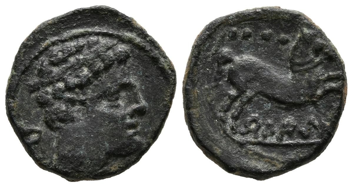 BELIGIOM (. Cuadrante. (Ae. 2,75g/15mm). 180-20 a.C. Anv: Cabeza diademada a derecha, detrás letra ibérica Be. Rev: Caballo saltando a derecha, encima tres puntos y debajo leyenda ibérica: BELIGio. (FAB-247). MBC+.