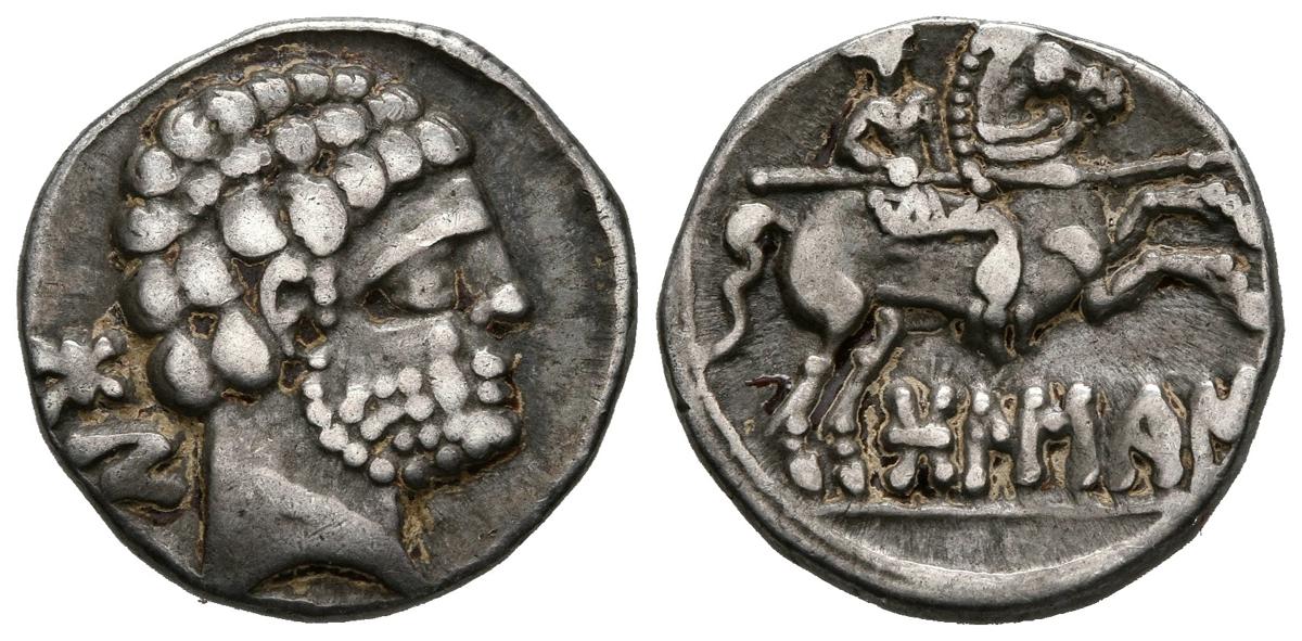 BOLSCAN (Huesca). Denario. (Ar. 3,81g/18mm). 120-20 a.C. Anv: Cabeza barbada a derecha, detrás letras ibéricas BoN. Rev: Jinete con lanza a derecha, debajo leyenda ibérica: BoLSCaN. (FAB-1911). MBC.
