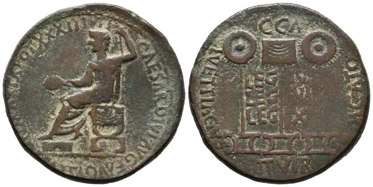 CAESARAUGUSTA (Zaragoza). Dupondio. (Ae. 17,24g/32mm). 14-36 d.C. Anv: Tiberio sentado a izquierda, alrededor leyenda: TI. CAESAR. DIVI. AVG. F. AVGVSTVS. PONT. MAX. TR POT. XXXII. Rev: Enseñas y vexilio, entre estos: LEG. IV. LEG. VI. LEG. X. (FAB-344). MBC-. Campos rebajados y repatinado