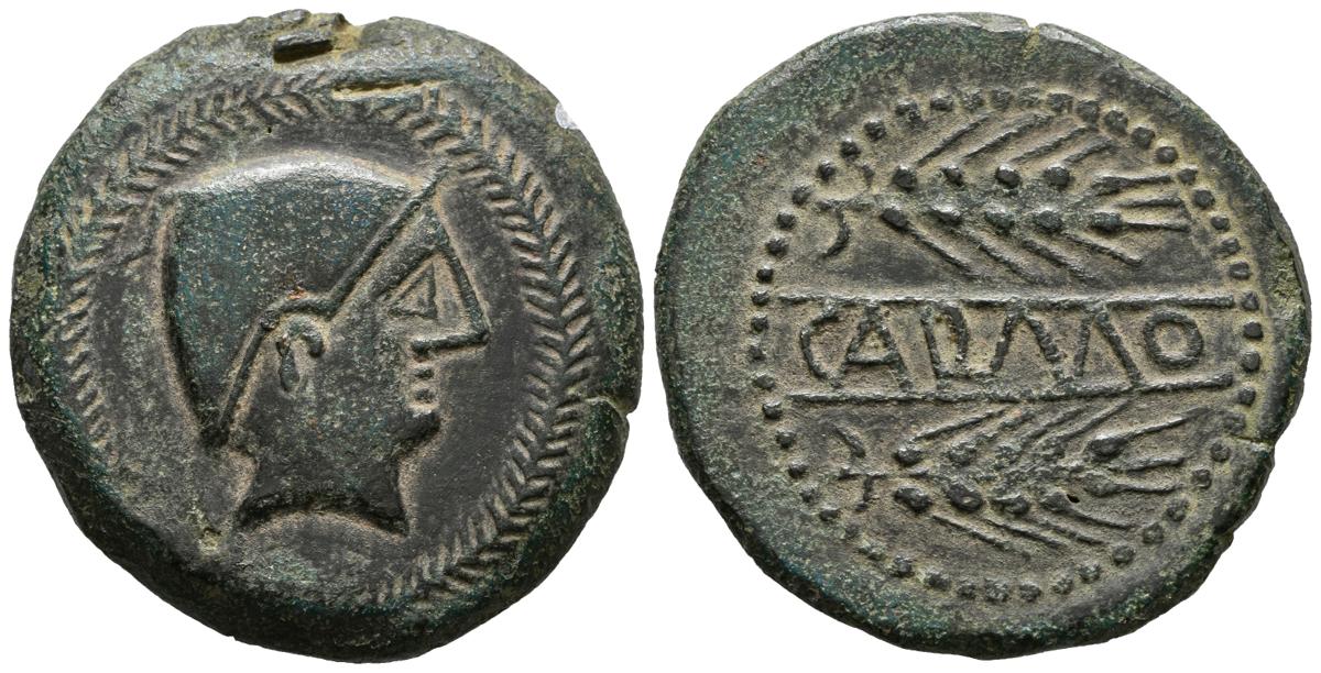 CARMO (Carmona, Sevilla). As. (Ae. 25,02g/33mm). 80 a.C. Anv: Cabeza masculina a derecha dentro de láurea. Rev: Dos espigas a derecha, entre ambas: CARMO. (FAB-454). MBC+. Repasado.