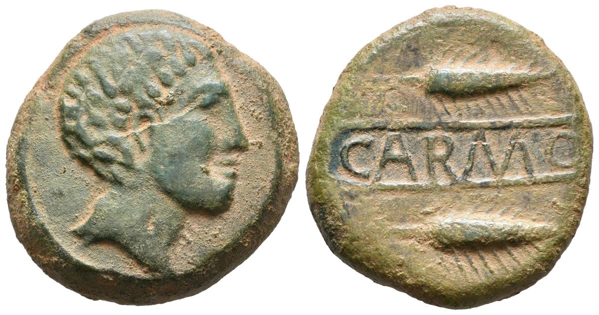 CARMO (Carmona, Sevilla). As. (Ae. 17,00g/26mm). 80 a.C. Anv: Cabeza masculina a derecha. Rev: Dos espigas a derecha, entre ambas: CARMO. (FAB-459). MBC.
