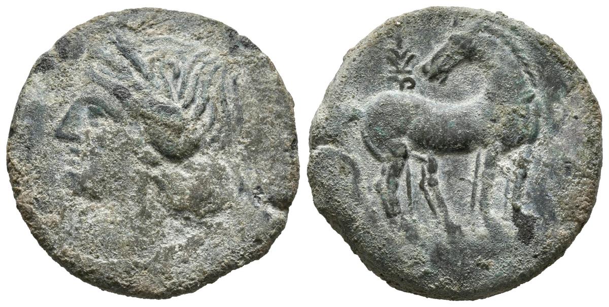 CARTAGONOVA (Cartagena, Murcia). Calco. (Ae. 8,08g/22mm). 220-215 a.C. Anv: Cabeza de Tanit a izquierda. Rev: Caballo parado con la cabeza vuelta, detrás palma. (FAB-503). MBC/MBC+.