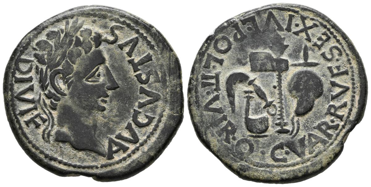 CARTAGONOVA (Cartagena, Murcia). As. (Ae. 13,81g/30mm). 27 a.C.-14 d.C. Anv: Cabeza laureada de Augusto a derecha, alrededor leyenda: AVGVSTVS. DIVI. F. Rev: Aspérgilo, símpulo, segur y apex, alrededor leyenda: C. VAR. RVF. SEX. IVL. POL. II. VIR. (FAB-577). MBC. Retocado y repatinado.