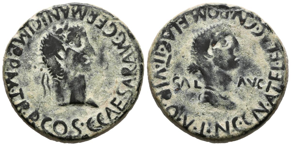 CARTAGONOVA (Cartagena, Murcia). As. (Ae. 12,63g/28mm). 37-41 d.C. Anv: Cabeza laureada de Calígula a derecha, alrededor: C. CAESAR. AVG. GERMANIC. IMP. P.M. TR.P COS. Rev: Cabeza laureada de Cesonia, a los lados SAL. AVG., alrededor: CN. ATEL. FLAC. CN. POM. FLAC. II. VIR. Q. V. I. N.C. (FAB-613). MBC. Repatinado.