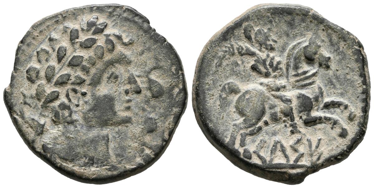 CELSE (Velilla del Ebro, Zaragoza). As. (Ae. 13,33g/27mm). 120-50 a.C. Anv: Cabeza masculina laureada a derecha, alrededor tres delfines. Rev: Jinete con palma a derecha, debajo leyenda ibérica CeLSE. (FAB-776). MBC.