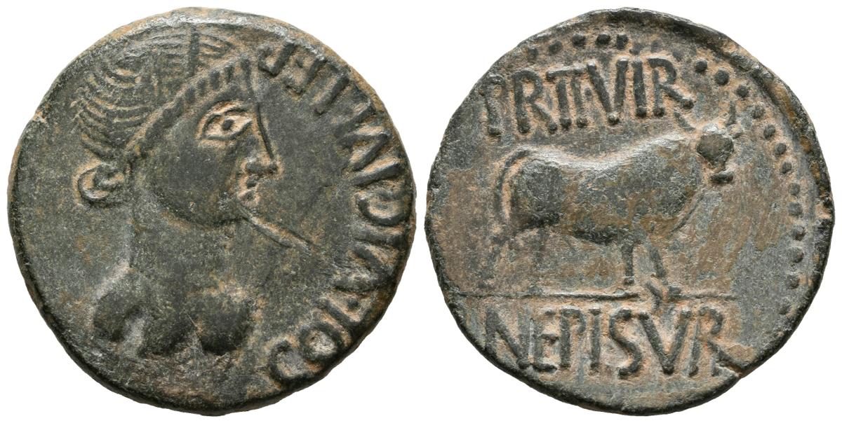 CELSE (Velilla del Ebro, Zaragoza). As. (Ae. 11,73g/29mm). 50-30 a.C. Anv: Busto femenino a derecha, delante: COL. VIC. IVL. LEP. Rev: Toro a derecha, encima: PR. II. VIR., debajo: L. NEP. L. SVR. (FAB-795). MBC+. Retocado.