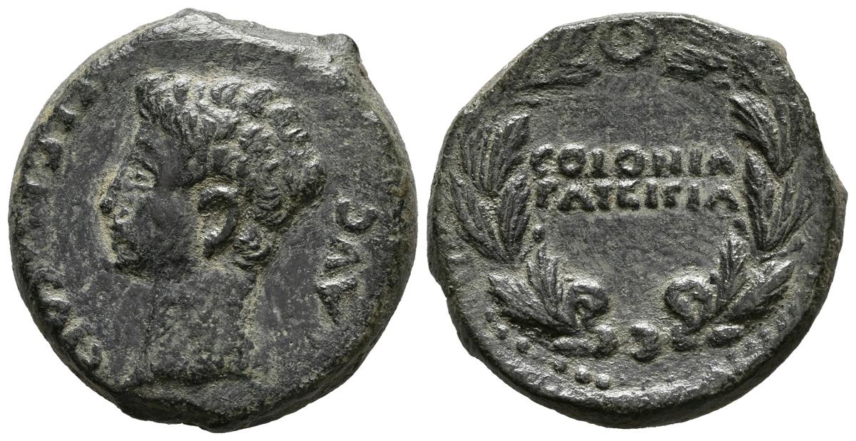 COLONIA PATRICIA (Córdoba). As. (Ae. 10,18g/24mm). 27 a.C-14 d.C. Anv: Cabeza de Augusto a izquierda, alrededor: PERM. CAES. AVG. Rev: Laúrea, en el centro: COLONIA. PATRICIA. (FAB-1989). MBC. Retocado.