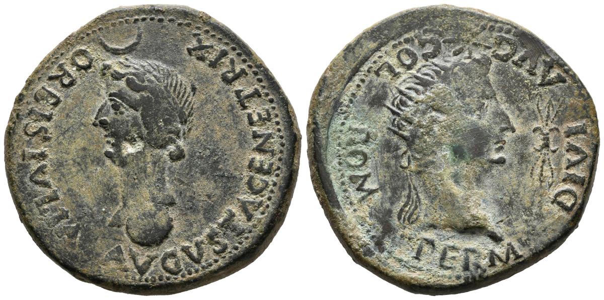 COLONIA ROMULA (Sevilla). Dupondio. (Ae. 26,09g/35mm). 14-36 d.C. Anv: Cabeza radiadade Augusto a derecha, delante fulmen, alrededor: PERM. DIVI. AVG. COL. ROM. Rev: Cabeza de Livia a izquierda, debajo globo, encima creciente, alrededor: IVLIA. AVGVSTA. GENETRIX. ORBIS. (FAB-2014). MBC.