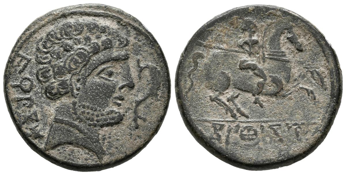CONTERBIA CARBICA (Huete, Cuenca). As. (Ae. 9,09g/25mm). 120-80 a.C. Anv: Busto masculino a derecha con barba, delante delfín, detrás leyenda ibérica: CaRBiCoM. Rev: Jinete con lanza a derecha, leyenda ibérica: CoNTeBaCoM. (FAB-848). MBC.