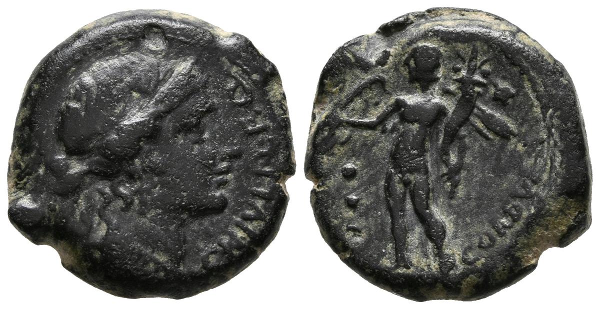 CORDUBA (Córdoba). Semis. (Ae. 6,74g/20mm). 50 a.C. Anv: Cabeza de Venus a izquierda, detrás tres puntos, delante leyenda: CN. IVLI. L.F.Q. Rev: Cupido con cornucopia y antorcha a izquierda, delante tres puntos, detrás: CORDVBA. (FAB-1984). MBC. Campos rebajados.
