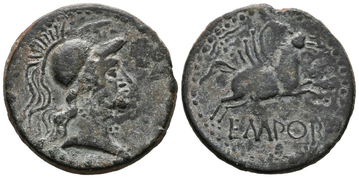 EMPORITON (Sant Martí d'Empúries, Gerona). As. (Ae. 11,88g/28mm). 50-27 a.C. Anv: Cabeza de Palas a derecha. Rev: Pegaso a derecha, encima laúrea, debajo: EMPOR. (FAB-1247). MBC.