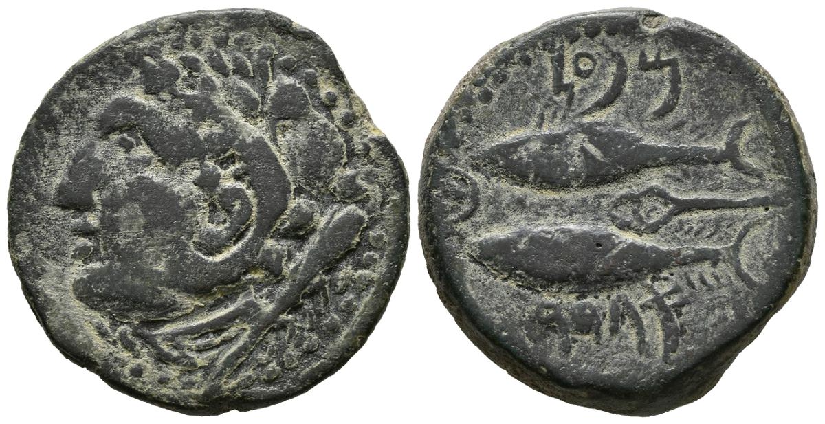 GADES (Cádiz). As. (Ae. 14,42g/27mm). 100-20 a.C. Anv: Cabeza de Hércules a izquierda, detrás clava. Rev: Dos atunes a izquierda, leyenda púnica arriba y debajo, entre ellos creciente con punto y caduceo. (FAB-1339). MBC+.