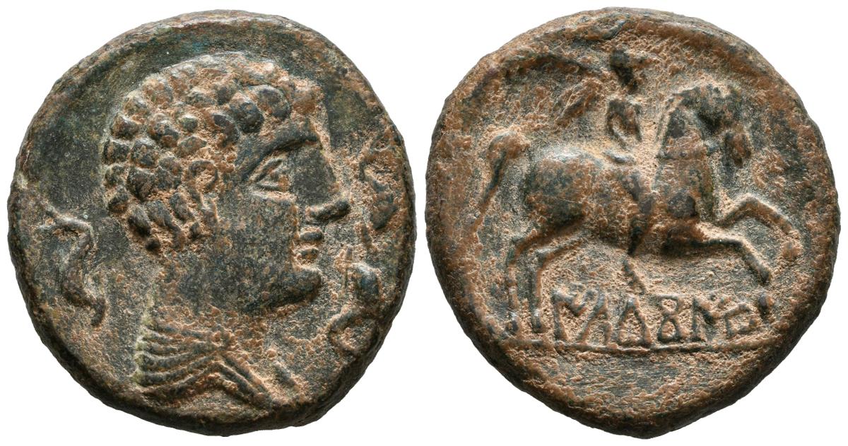 ILDUCOITE (Zona de Cataluña). As. (Ae. 15,72g/27mm). 120-20 a.C. Anv: Cabeza masculina rodeada de tres delfines. Rev: Jinete con palma, debajo leyenda ibérica: ILDuCoITE. (FAB-1428). MBC+. Escasa. Campos rebajados.