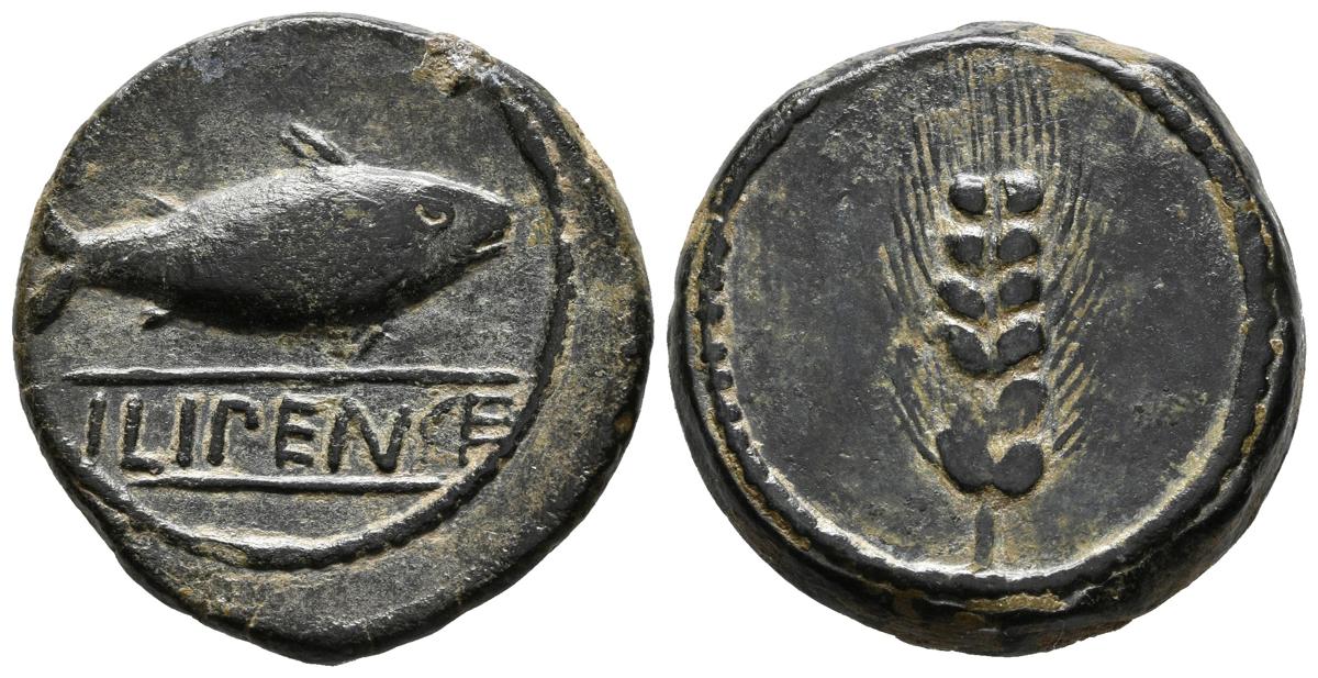 ILIPENSE (Alcalá del Río, Sevilla). Semis. (Ae. 10,25g/25mm). 120-20 a.C. Anv: Sábalo a derecha, debajo leyenda: ILIPENSE. Rev: Espiga. (FAB-1534). MBC. Perfilado.