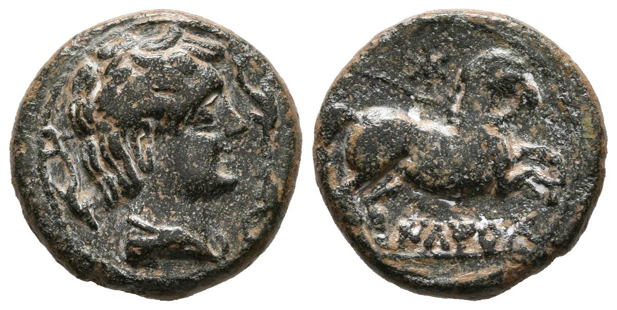 ILTIRTA (Lérida). Cuadrante. (Ae. 2,85g/15mm). 200-20 a.C. Anv: Cabeza masculina rodeada de tres delfines a derecha. Rev: Caballo a derecha, encima estrella, debajo leyenda ibérica: ILTiRTa. (FAB-1468). MBC+/MBC.