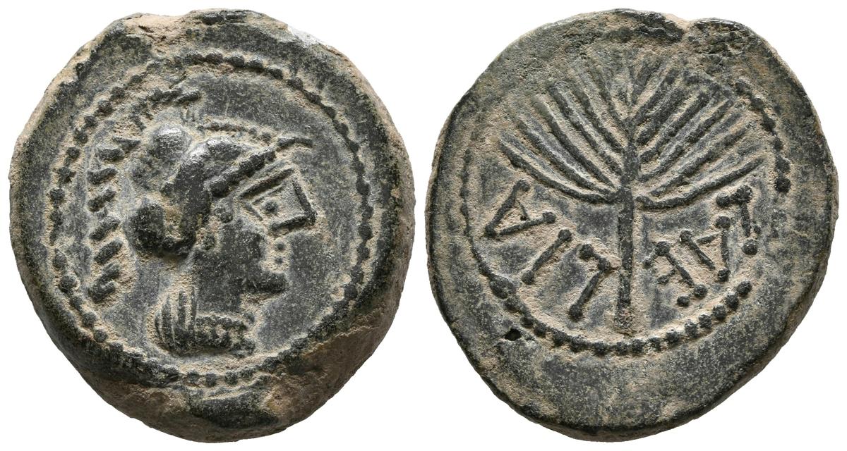 LAELIA (Olivares, Sevilla). Semis. (Ae. 12,36g/25mm). 50-20 a.C. Anv: Cabeza con casco a derecha. Rev: Palma, debajo leyenda invertida: LAELIA. (FAB-1651). MBC+.