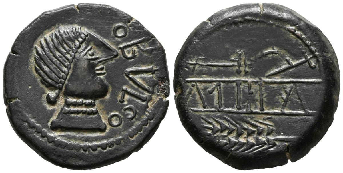 OBULCO (Porcuna, Jaén). As. (Ae. 14,18g/29mm). 220-20 a.C. Anv: Cabeza femenina a derecha, delante leyenda: OBVLCO. Rev: Arado a derecha, debajo espiga, entre ambos leyenda ibérica: IBuLCa. (FAB-1804). EBC-. Campos repasados.