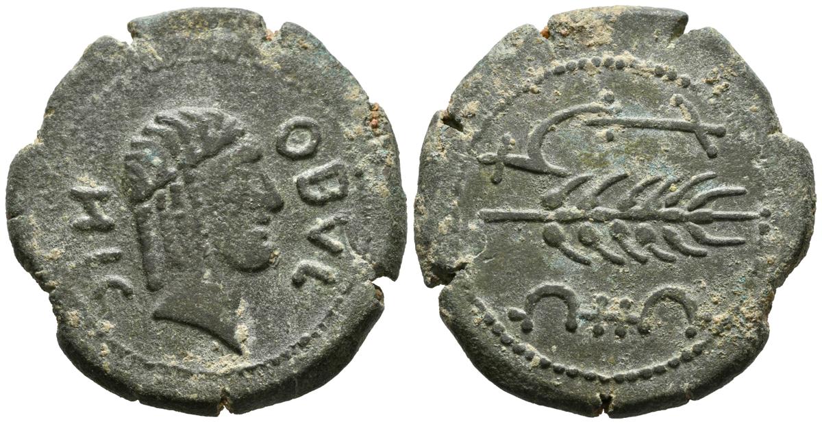 OBULCO (Porcuna, Jaén). As. (Ae. 25,48g/35mm). 220-20 a.C. Anv: Cabeza laureada de Apolo, delante OBVL, detrás NIG. Rev: Arado a derecha, espiga a derecha y yugo. (FAB-1826). MBC+. Flan muy grande. Campos rebajados.