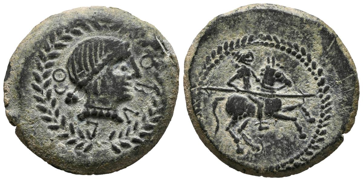 OBULCO (Porcuna, Jaén). Semis. (Ae. 9,64g/26mm). 220-20 a.C. Anv: Cabeza de Apolo a derecha dentro de láurea, delante leyenda: ILNO. Rev: Jinete con lanza a derecha. (FAB-1830). MBC+. Escasa así.